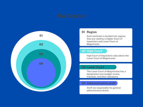 Taking his knowledge of hierarchy and governmental structure, Acillius helped devise a system with "more efficient checks and balances than the Roman government". He, Zanna, Halifax, Cara, and others from the Inner Circle decided that two courts would reign, one higher court of Inquisitors and another Lower Court of Magistrates. Over time, as their numbers grew, they divided up countries into regions so that their populous could be efficiently governed. During the 1600's The Council's structure underwent a revision and was then simplified to resemble the current system. The Inner Circle, as a function of the government's structure, was dissolved in order to avoid having too much power centralized in a small group. In 1689, the Articles of Jurisprudencce were created as a structure for the new framework of The Council.